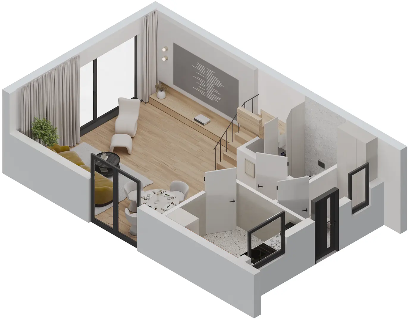 – wejście na piętro – schody wewnętrzne betonowe (wylewka betonowa bez stolarki),